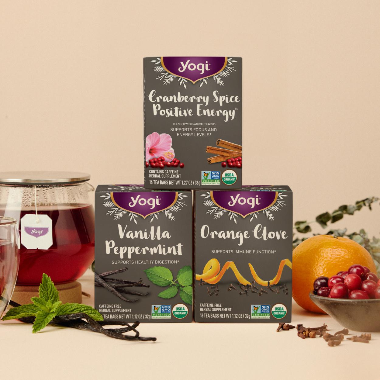 The Yogi Tea Holiday Bundle wraps up a trio of tea blends that offers coziness and comfort for day-to-night winter wellness. Kickstart your morning with NEW Cranberry Spice Positive Energy, a bright and tart, rejuvenating blend that combines cranberry and cinnamon with the balanced energy boost of green tea. As the day winds down, sip on spiced Orange Clove with astragalus to support immunity, and savor sweet, cooling Vanilla Peppermint blended with relaxing ashwagandha for a blissful post-dinner treat.